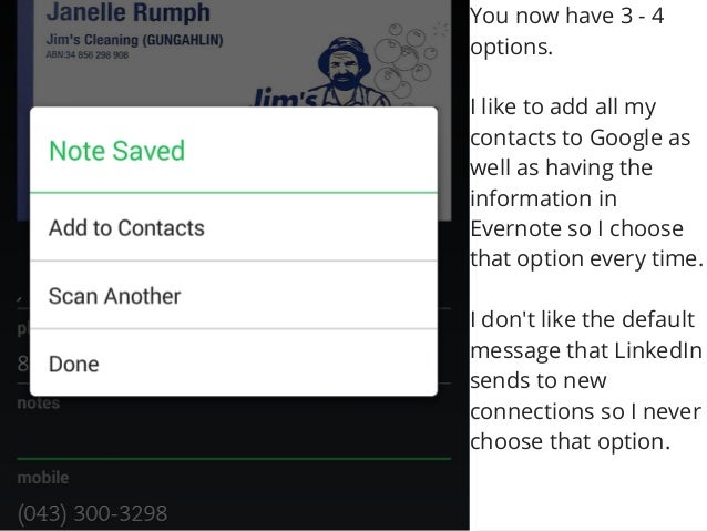 Tap (don't swipe) on business. Create a notebook called business cards in which all business cards will be saved.; Tag the card with the relationship to you, eg. I frequently find the need to export contacts i've collected using evernote's excellent business card photo feature. I was wondering if i can batch scan these cards into evernote.